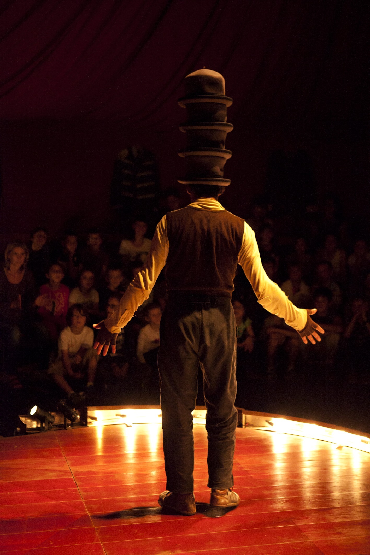 C’est un véritable spectacle de cirque qui naît sous nos yeux dans ce chapiteau aux proportions réduites. Tout y est : on y retrouve la technique, l’adresse, l’incroyable et le comique. Les deux artistes, perdus au milieu d’un fouillis de vieilleries, enchaînent les numéros : jonglerie, dressage, équilibre, clowneries.