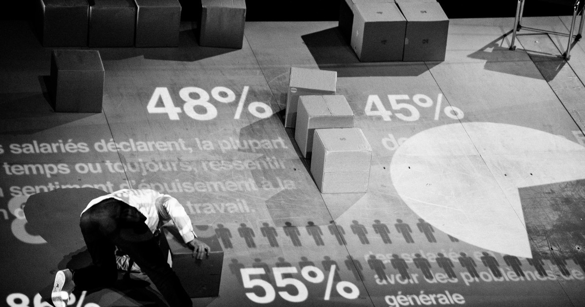 Quand le lundi, « ça va comme un lundi » et le vendredi, « ça va comme un vendredi », en fait, plus rien ne va ! La souffrance et le chagrin s’installent : « dans le travail, l’affect a toute sa place ». La voix off de Laurence Vielle, mécanique et artificielle, décrit l’enfer que vivent certains travailleurs tandis que Julien Fournier traduit cette pression en déplaçant des caisses en carton à une cadence effrénée tout en parcourant un plan incliné avec agilité. Le spectacle est aussi très esthétique, notamment lorsque les caisses se transforment en gratte-ciels, grâce à l’appui de la vidéo de Yannick Jacquet.