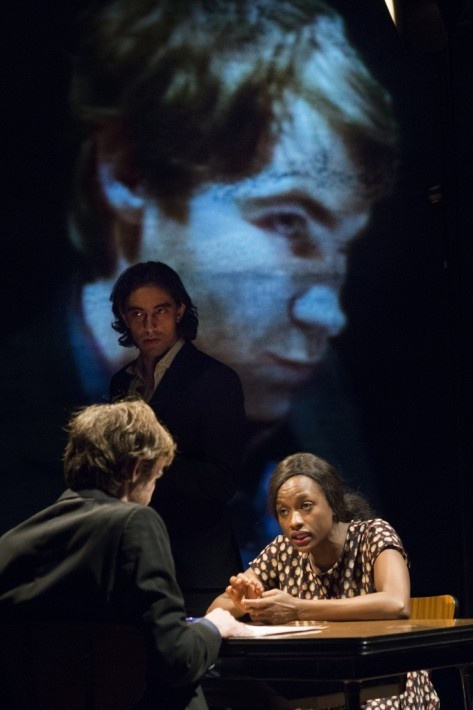 A titre d’exemple, citons la reconstitution cinématographique filmée en direct en champ/contrechamp et projetée sur un écran en arrière scène. La séquence reprend dans un style documentaire un entretien entre un fonctionnaire (joué par un acteur) et une demandeuse d’asile (qui joue son propre rôle). Un tel dispositif permet plusieurs niveaux de jeu : l’acteur s’interrompt pour adresser « face caméra » les états d’âme de son personnage. Il reprend ensuite le fil de la discussion puis s’interrompt une seconde fois pour demander à sa partenaire s’il ne rend pas son personnage trop détestable. Elle lui répond qu’au contraire le fonctionnaire réel était bien plus toursiveux, bien moins aimable. On peut alors apprécier le changement de ton lorsque l’acteur intègre ces nouvelles données dans son jeu.