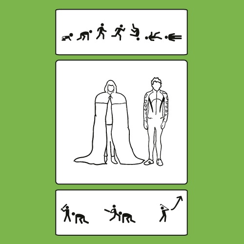 Les premiers éléments au début du spectacle nous interpellent fortement : des rires enregistrés à l’ambiance Hélène et les Garçons, et une salle allumée grâce à deux grands néons suspendus en hauteur. Et débarquent alors, par la grande porte du fond, Tristan et Marceline. Elle avec sa grande cape pailletée, lui avec sa combinaison de cycliste. Avec pour décor, un espace vide et pourtant, qui fourmille tant de combinaisons possibles pour rendre Char d’Assaut vivant. Et c’est là que l’histoire commence, par une promenade autour du public, en traversant les portes.