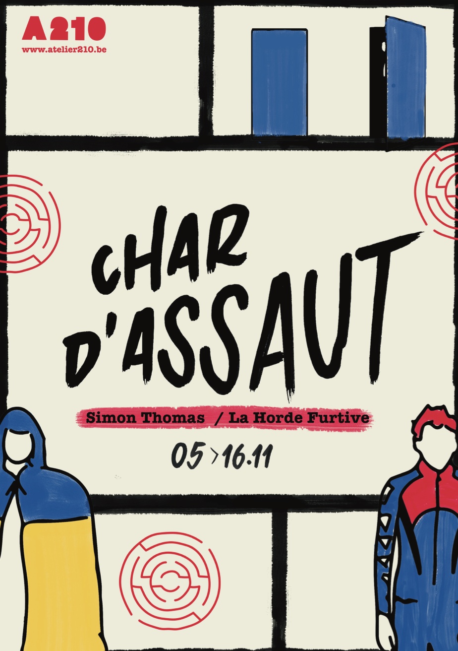 Les premiers éléments au début du spectacle nous interpellent fortement : des rires enregistrés à l’ambiance Hélène et les Garçons, et une salle allumée grâce à deux grands néons suspendus en hauteur. Et débarquent alors, par la grande porte du fond, Tristan et Marceline. Elle avec sa grande cape pailletée, lui avec sa combinaison de cycliste. Avec pour décor, un espace vide et pourtant, qui fourmille tant de combinaisons possibles pour rendre Char d’Assaut vivant. Et c’est là que l’histoire commence, par une promenade autour du public, en traversant les portes.