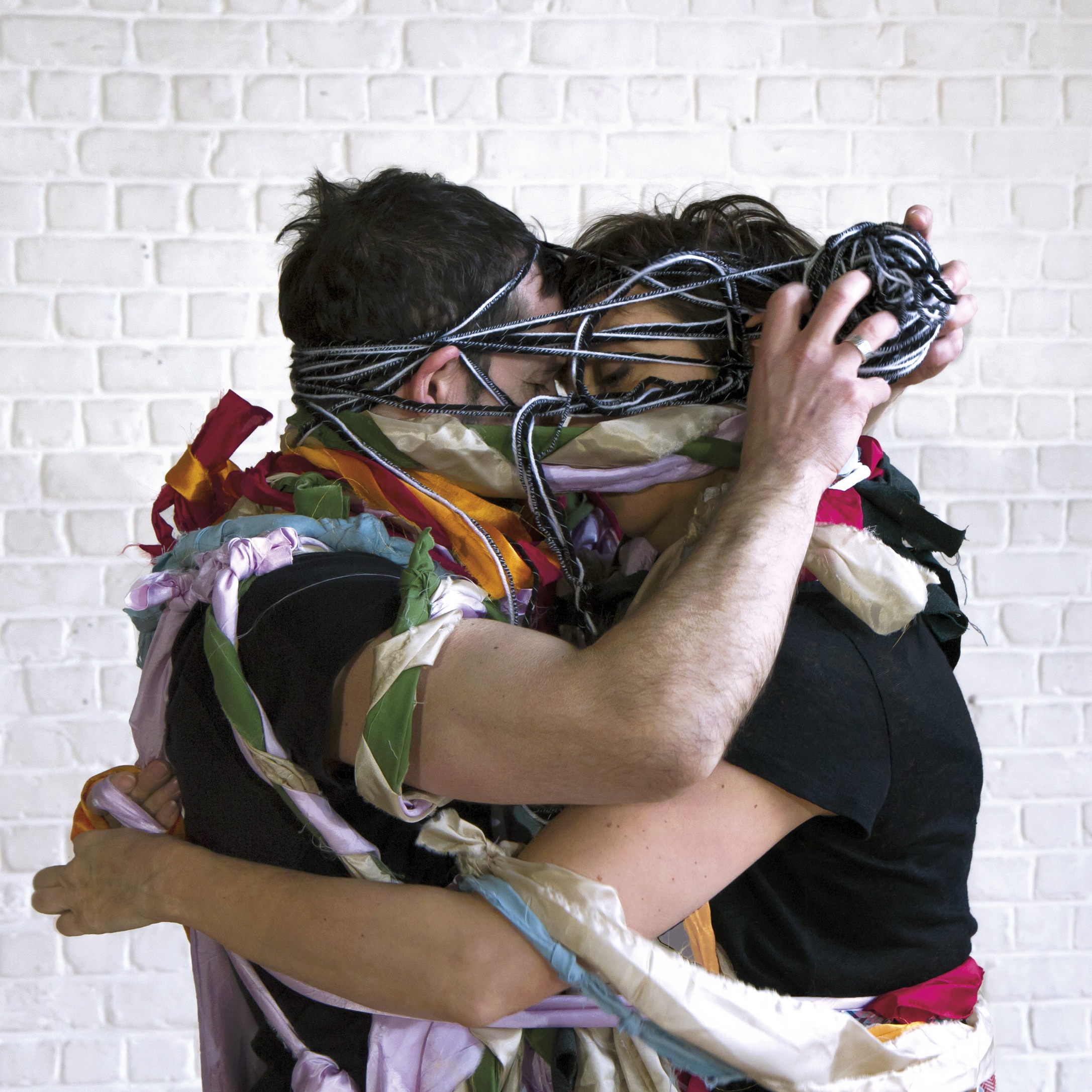Au centre du plateau, un amas de chiffons. Un homme tourne autour, enfile un gant en latex et plonge la main dans le tas. Il en sort une pelote de fil qu’il met dans sa poche. Le fil ressort par l’autre poche. Il dévide la bobine aidé par les autres personnes qui tissent une étrange toile qui recouvre le plateau.