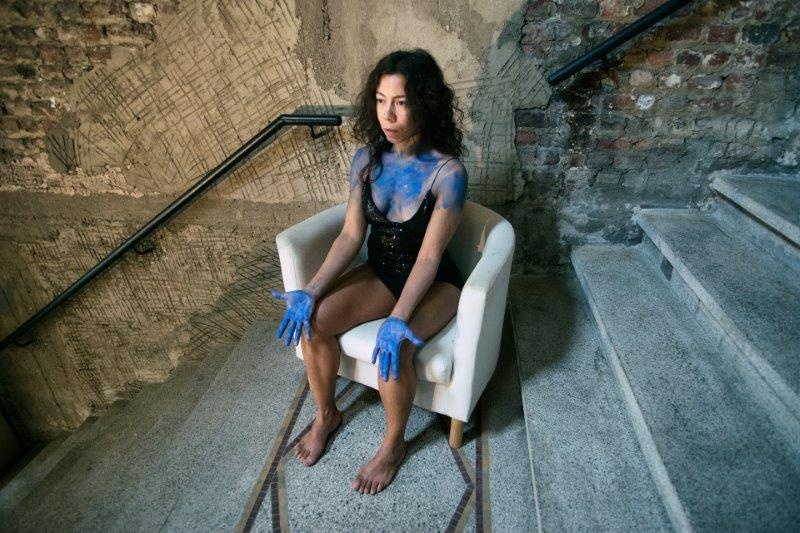 Elle se débarrasse du tablier noir dévoilant son top à grosses paillettes, défait ses cheveux, étale du blanc sur son visage puis du carmin sur son torse, son cou, ses bras. Elle déambule sur le plateau, fixant les spectateurs. S’arrêtant sur une carte, elle entame une sarabande frénétique, comme si elle était possédée, avant de retrouver le sourire. Plus loin, elle s’écroule au sol et semble prise de convulsions.