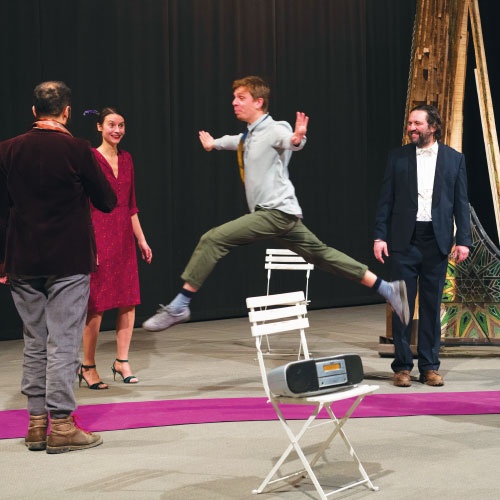 Au centre de la scène, un arbre-totem énigmatique. Trois personnes attendent... Grands sourires. Un jeune homme, habillé en randonneur, descend enfin du train. Un verre à la main, Clowdia ( Eléna Doratiotto), Madame Störh (Anne-Sophie Sterck) et Obertini ( Benoît Piret) accueillent Andréas (Jules Puibaraud). Pas de chichi, mais une ambiance sympathique. Le visiteur repère les chambres, le réfectoire, le jardin et pénètre dans le grand hall, qui abrite un polyptyque. Ces quatre tableaux racontent comment, en 1532, 168 Espagnols commandés par Francisco Pizarro ont vaincu les 30.000 hommes d’Atahualpa. D’un ton détaché, Obertini décrit le piège tendu par le conquistador, assoiffé d’or. La bataille de Cajamarca a tourné au massacre. L’empire inca ne s’en est pas remis.