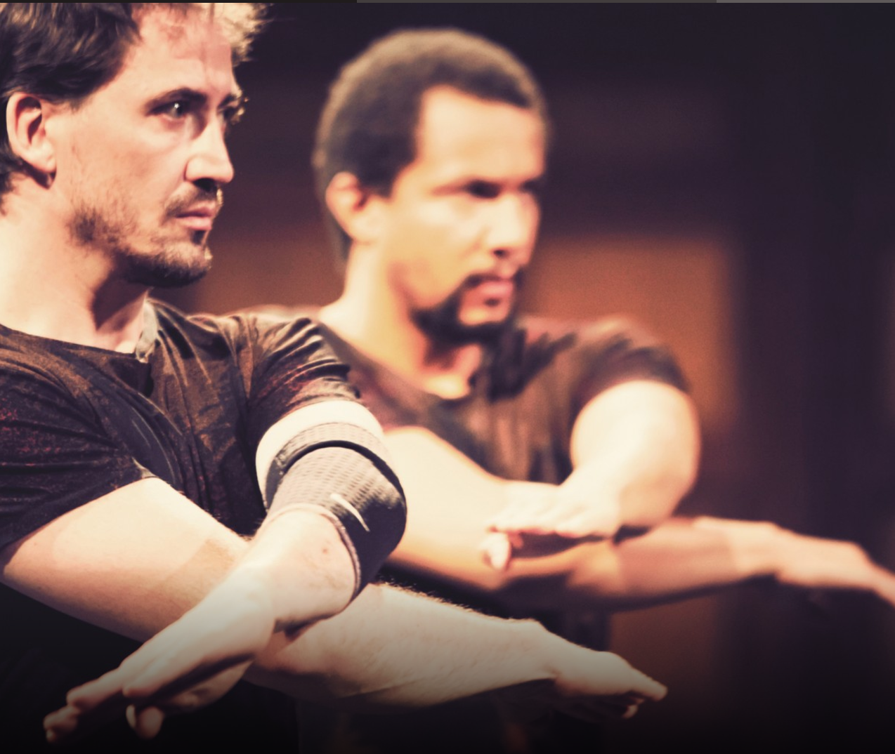 Deux interprètes vêtus de noir répètent des séries de gestes sémaphoriques dont la géométrie en mouvement, d’abord synchronisée, se décale progressivement jusqu’au brouillage inaudible, puis hésite en crescendo entre canon et unisson.