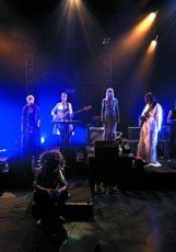 Le plus marquant du spectacle, c’est ce groupe décalé qui l’accompagne dans sa mythologie. Greg Rémy en Chubaka des neiges connote avec humour ce tableau grisâtre. Le guitariste de Ghinzu prendrait-il d’ailleurs vraiment goût au théâtre (on l’avait entendu l’année passée dans Play Loud de Falk Richter) ? Les trois comédiennes (Olivia Carrère, Lucie Debay et Laura Sépul) poussent quant à elles la voix sans complexe et sont très crédibles dans leur côté « bêtes de scène ». Raven Ruëll garde lui son petit accent flamand qui rend clairement son jeu plus vrai que nature, celui du fils formulant ses reproches au père absent.