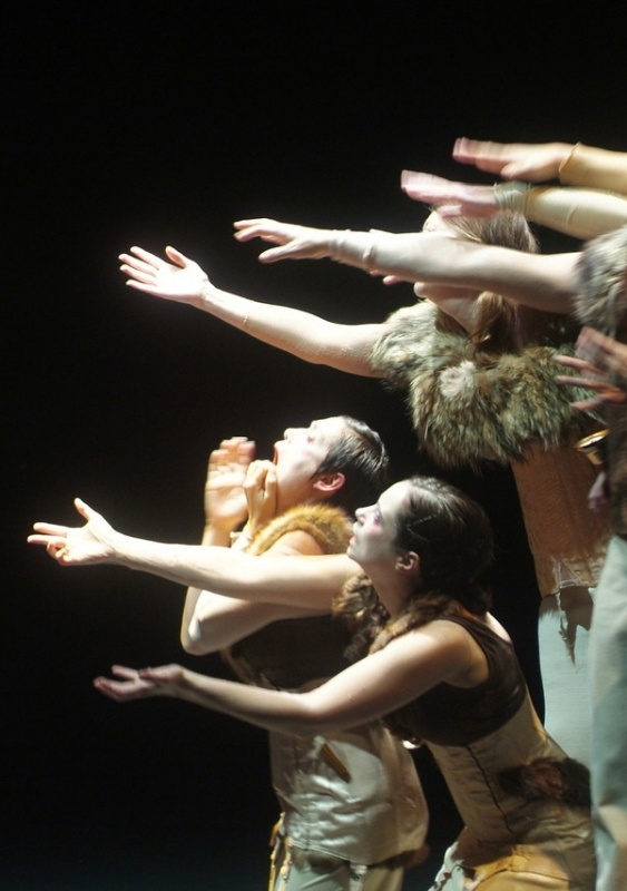 Un long trait de lumière posé au sol attire les comédiens comme des papillons de nuit ou des hirondelles perchées sur un fil télégraphique. Ainsi se met en place un chœur mi antique, mi avant-gardiste, installé au bord du vide ou du néant. La cohésion qui se crée par le rassemblement des corps à corps fait imaginer une sorte de créature puissante et vivante en forme d’arabesque. La condition humaine qui ne cesse de chercher l’Absolu dans le mouvement et le chant ? L’étrange et langoureuse bacchanale va naître sur le Kyrie à la manière d’une improvisation et puis s’envoler au gré des autres prières de la liturgie. Celles-ci sont réinventées librement sur l’étoffe de la partition de Bach. Dans un déséquilibre constant ils s’efforcent généreusement de mettre leur corps et leurs voix au service du texte chanté, murmuré, scandé, vibré ! Une renaissance perpétuelle de tableaux vivants, comme des cellules en harmonie s’offre au public au fil des incantations universelles perlant sur des gestes familiers et des attitudes quotidiennes. Esprits en union ou union d’Esprit ? Au milieu du chaos apparent, les déplacements et les voix des danseurs et danseuses deviennent au fur et à mesure sidérants d’harmonie et de précision. Et pourtant on les croit toujours tous, prêts à tomber, comme dans un château de cartes.