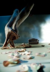 Sur la scène, on observe le petit monde de Gisèle, en construction. Une poupée, un aquarium, un train téléguidé, qui une fois transposés à l’écran par l’œil expert du cameraman prennent taille humaine, et deviennent les acteurs de notre frénétique quête de l’amour perdu. De la même manière, les vingt doigts souples et précis des deux danseurs se font corps, timides et blessés, mais aussi sensuels et aguicheurs, amoureux, curieux, et n’ont certainement rien à envier aux jambes de leurs confrères.
