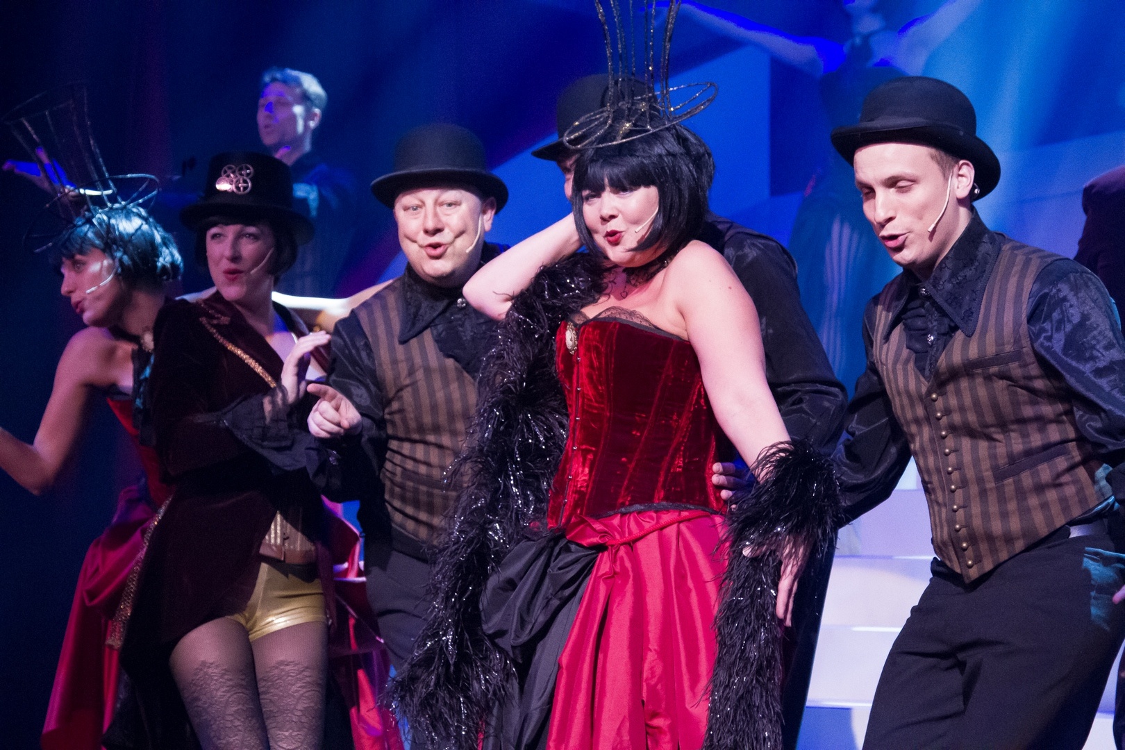 Le concept de revue est devenu rare sur les scènes belges. La satire et la parodie enrobées de musique, de danses et de sketches se doit de relever le défi du renouveau. Les Galeries ont choisi de porter le flambeau en intégrant des médias nouveaux. L’équipe a pris le parti de chérir une pointe de nostalgie en offrant un spectacle où les rouges et ors de la belle époque rejoignent les exigences contemporaines. La scénographie à paliers et le grand final au rythme et aux couleurs du French Cancan vous en mettront plein les yeux.