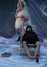 Malgré cela, on appréciera franchement l’originalité de la mise en scène. Mises en valeur par une configuration spécifique du foyer, les deux actrices épatent, jouent juste devant notre nez et n’hésitent pas à apostropher leur public ou à s’asseoir parmi les spectateurs. Cette proximité rend l’expérience encore plus prenante et permet aux actrices d’imposer plus facilement leur univers déjanté. Le plateau est juste à nos pieds, rempli d’objets incongrus et de matériaux qu’utilisent les personnages pour mettre le bordel sur scène.