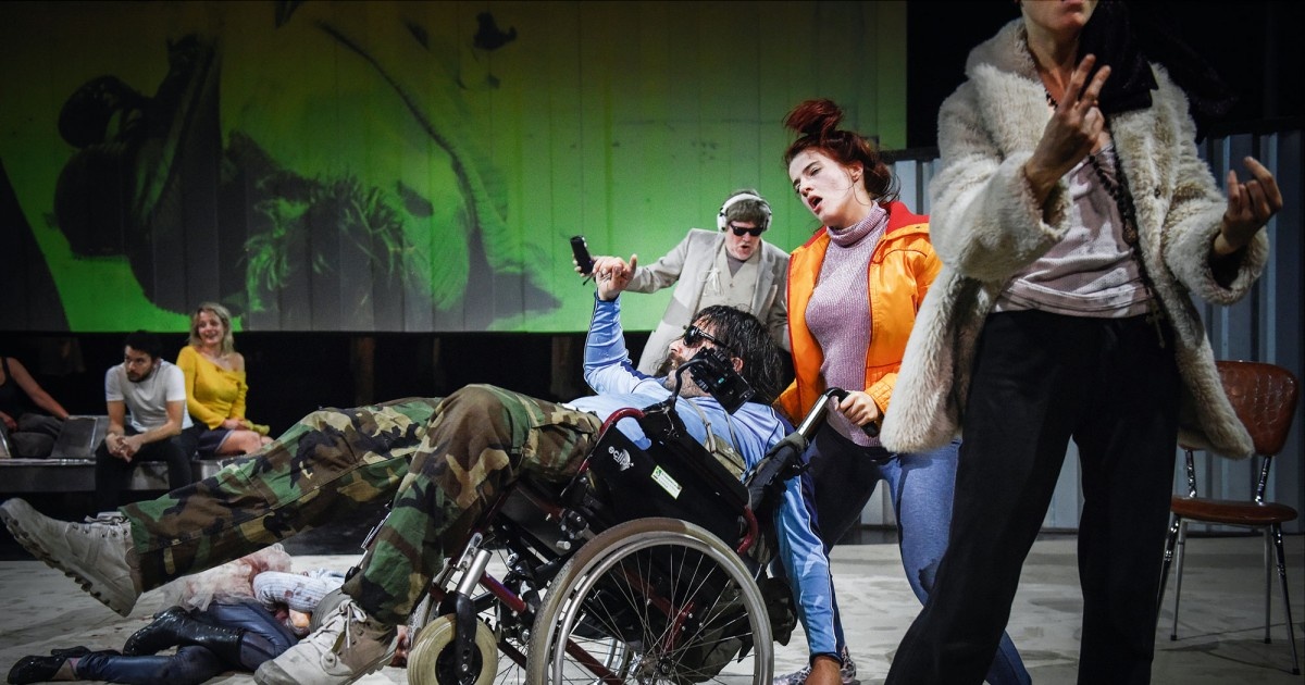Dans un angle du plateau, un petit abri fait de tôles laisse s’échapper des bribes de conversations. Une caméra s’y faufile, laissant apercevoir une misère ordinaire : celle des pourparlers sans fin avec les agents sociaux, des cris, de la colère et des situations expliquées à demi-mots, entre la crainte et la honte. Il ne faut cependant pas s’y tromper, la vérité se trouve ailleurs. Au centre de la scène, éclairés par une lumière blafarde, des hommes et des femmes se trainent, crachent, saignent, mangent parfois à même le sol. Sans aucune fausse pudeur, l’œuvre expose la réalité crue de la pauvreté et nous laisse seuls avec notre malaise. S’il est tentant, par moments, de détourner le regard, les personnages nous rappellent sans cesse à l’ordre dans un face à face qu’il nous est dorénavant impossible d’ignorer.
