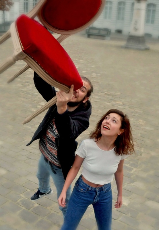 Ce sont les metteurs en scène et comédiens, Salomé Crickx et Iacopo Bruno, qui accueillent le public en proposant café ou jus d’orange. Les siège sont disposés en U autour du plateau. Le comédien actionne une petite boîte à musique qui joue l’internationale. « Moi je suis communiste et comme les martiens les communistes sont d’une intelligence supérieure. » Il se targue également de pouvoir traverser les murs et de pouvoir dire les mots à l’envers. « Avec des mots à l’envers, on change tout, on fait la révolution. Les mots, tu les retournes, pas le monde, et tu perds espoir. »