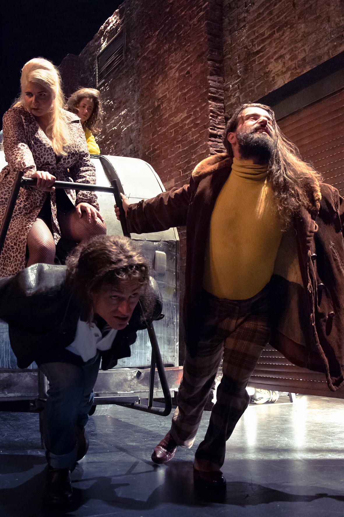 A ses côtés, et participant à mettre en lumière ce personnage, Anthony Sourdeau (Eilif) et Valentin Vanstechelman (Fromage Suisse) font un véritable travail de création de personnages. Posture corporelle, diction, comportements et autres petits tics, tout ce qu’il faut pour les rendre suffisamment louches pour que Mère Courage paraisse finalement plus humaine encore. Et, grande réussite, cela n’entache pas la cohérence de jeu. On retrouve chez presque tous cette étrangeté, cette anomalie, cette laideur qui contribue au caractère épique du théâtre : un cuisinier qui n’a pas une once de honte à rejeter la fille de sa compagne pour s’en sortir, un prédicateur boiteux qui n’hésite pas à renier à sa foi pour survivre, une prostituée qui utilise le malheur d’une amie pour négocier à son avantage, ...Chapeau enfin à Sarah Joseph, dans le rôle de Kattrin, qui transmet, malgré le mutisme de son personnage, des sentiments très forts au public, et à l’état brut : angoisse, colère, déception. De manière tout à fait inattendue, cette absence de parole, bien qu’un défi d’interprétation brillamment relevé, est sans doute ce qui fait de Kattrin un des éléments essentiels auquel, en tant que public, on peut s’identifier : tout le monde a déjà eu la sensation aliénante de n’être pas compris, ou pas écouté. C’est sans doute pour cela que les frissons arrivent lorsqu’elle monte à la fenêtre pour avertir la ville à coup de marteau, et que son rire de folie nous touche si brusquement.