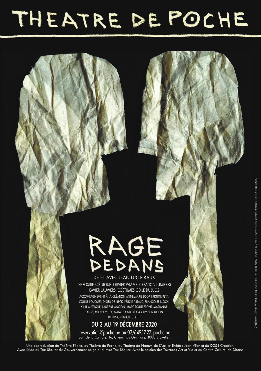 De et avec Jean-Luc Piraux I Scénographie Olivier Wiame I Lumières Xavier Lauwers I Costumes Odile Dubucq I Accompagnement à la création Anne-Marie Loop, Brigitte Petit, Coline Fouquet, Didier de Neck, Félicie Artaud, Françoise Bloch, Karl Autrique, Laurent Ancion, Marc Doutrepont, Marianne Hansé, Michel Villée, Natacha Nicora & Olivier Boudon
