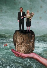 Un couple on ne peut plus ordinaire : a beautiful house in a residential area, la voiture rouge, le crédit. Et puis tout d’un coup, il n’y a plus rien, sauf le chien. Les deux acteurs en scène voient progressivement leur faible capital s’envoler et les objets qui constituent leur vie disparaître de la table qui est devant eux. The beautiful house is lost, la chemise élégante qui va avec aussi. Les voilà subitement à moitié nus devant une mer de velours bleu, errant sur un rafiot de fortune, transposition poétique de leur état de détresse. Elle et lui, aux côtés du chien en plastique, poussent la chansonnette pour raconter leur histoire terrible accompagnés par un petit clavier au son métallique.
