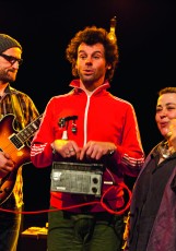 Antifreeze solution est inspirée des trois derniers albums du groupe Tomassenko, particulièrement d’Organetta, leur sixième et dernier album, présenté lors de la Première, mardi dernier. L’assemblage mélange avec brio les différentes ambiances, en transbahutant le spectateur du franc éclat de rire au sourire attendri. Nous saluerons la performance des trois protagonistes qui, au travers de ce patchwork bigarré, rebondissent avec virtuosité d’une discipline à l’autre, tout en incarnant du début à la fin des personnages drolatiques, un peu naïfs voire par moments complètement zozos, mais toujours terriblement attachants. Olivier Thomas assume pleinement le rôle central et mène la barque avec simplicité et franchise dans un sympathique français d’entre Sambre et Meuse.