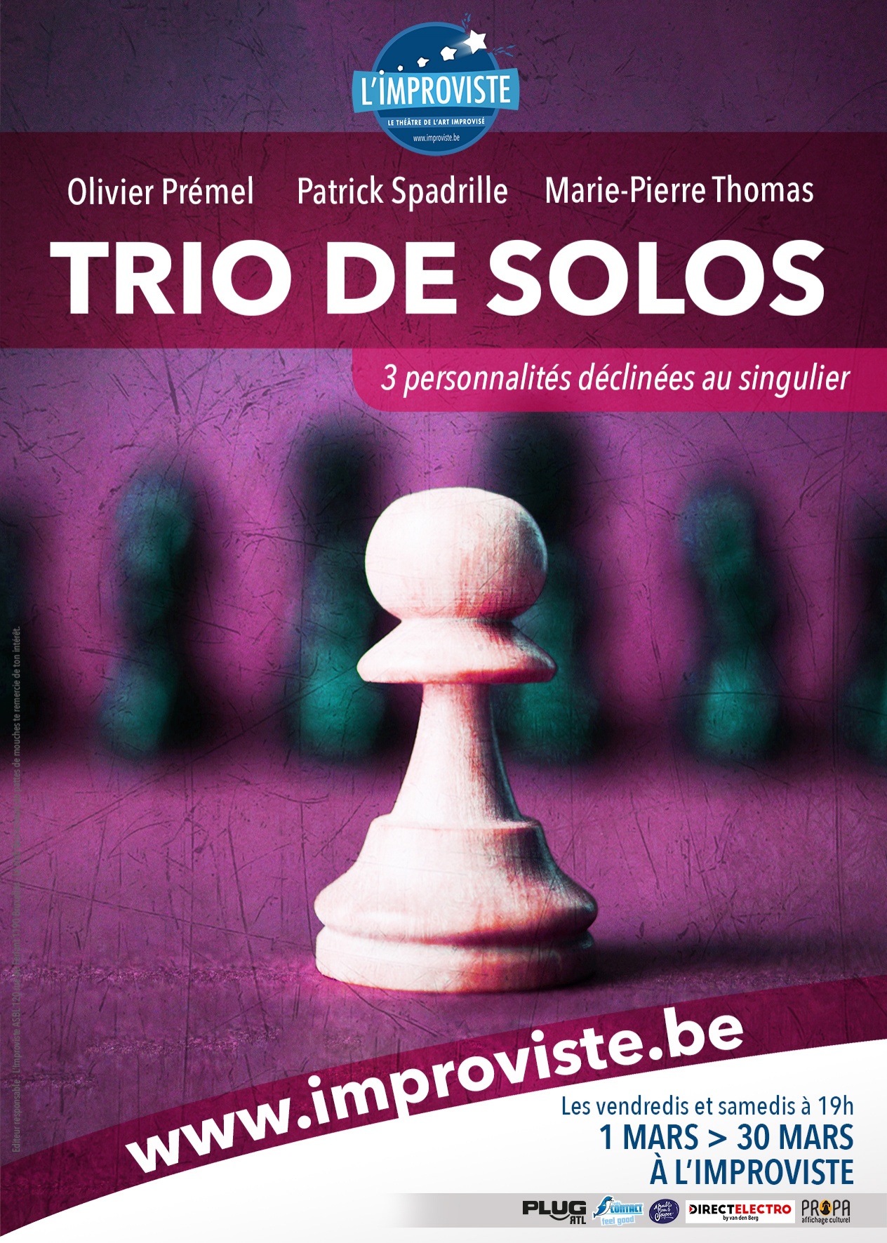 Etre seul face au public, face à soi-même. Que se passe-t-il quand le seul partenaire de jeu du comédien c’est lui ? Entrer dans le monde intime du jeu au singulier. Découvrir un univers personnel, sans compromis. C’est ce que vous propose, en alternance selon les dates, ces 3 improvisateurs faisant tous partie de la troupe du spectacle Page Blanche : Olivier Prémel, Patrick Spadrille et Marie-Pierre Thomas. 3 solos, 3 concepts, 3 sensibilités.