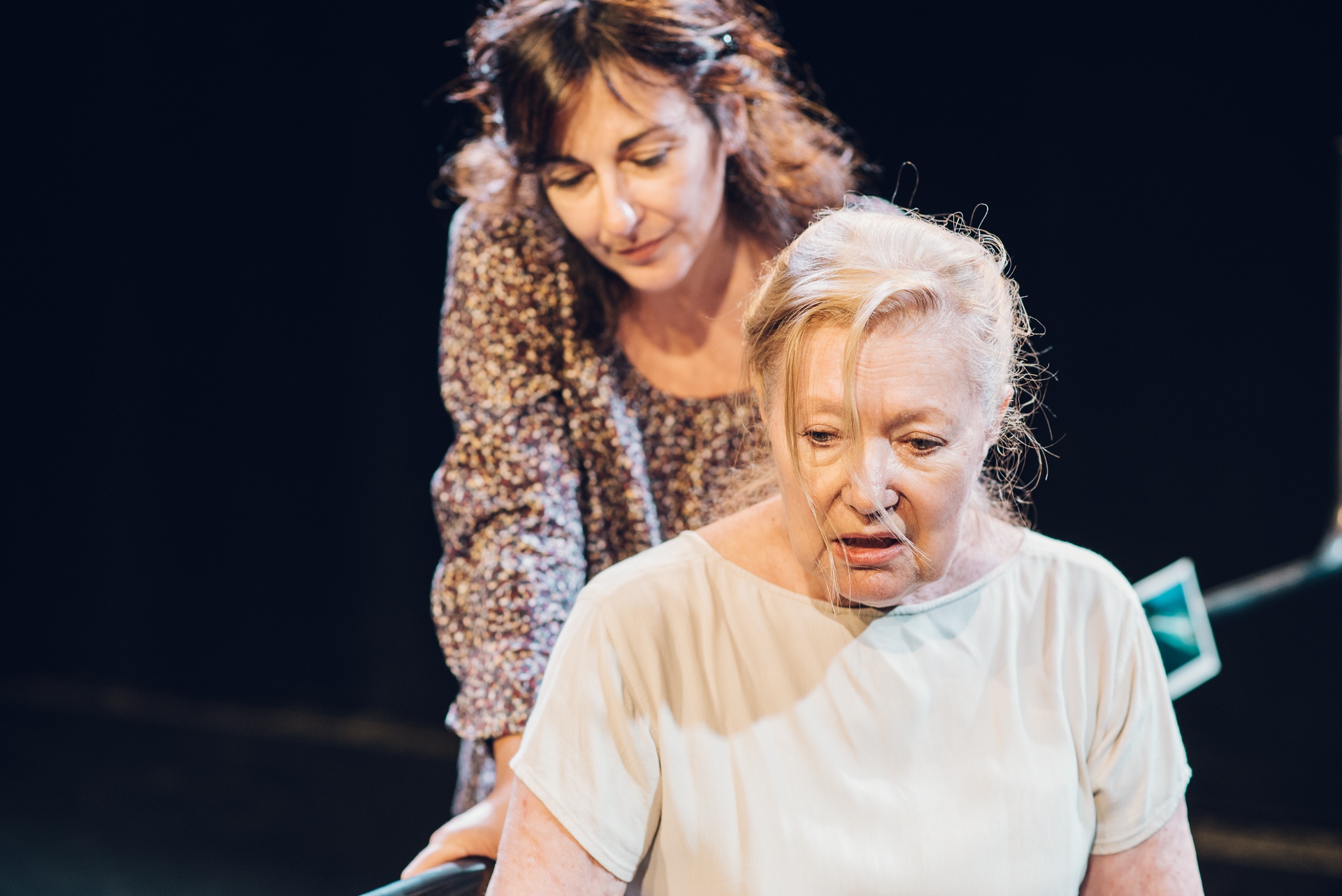 L’alternance de monologues et de dialogues insuffle à la pièce un rythme alerte. Souvent narratrice, Evelyne précise ses rapports avec Madeleine, mais décrit aussi, avec une sobriété poignante, la détresse des autres résidents, à l’affût d’un moment d’attention. Dans son texte sensible, comme dans sa mise en scène dépouillée, Christian Dalimier fuit tout apitoiement. Pas de matériel médical ni de relents pharmaceutiques. Sur le plateau nu, une imposante barre pivotante. Selon les séquences, elle sépare des territoires, offre un appui, fait remonter les souvenirs ou tournoyer les robes. En incarnant Madeleine avec une grande justesse, Nicole Valberg rend cette femme égocentrique très attachante. Sans forcer le trait, elle passe en souplesse d’une résidente frustrée à une gamine rieuse, d’une malade qui sombre dans la confusion à une vieille dame protégée par sa nostalgie. Grâce à son jeu tout en retenue, Laetitia Reva nous fait sentir comment son empathie avec Madeleine la sauve du désespoir. On est subjugués par ce duo de comédiennes, qui éclaire remarquablement le texte subtil de Christian Dalimier.