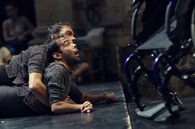 Une chaise roulante électrique traverse le plateau nu. L’homme, il s’appellera Bernard toute la soirée, tout sourire, fait un tour de piste et s’éclipse par la porte à l’opposé. Un autre homme un rien paniqué, vêtu à l’identique, déboule les escaliers, une lampe torche à la main, avant de disparaître à son tour.