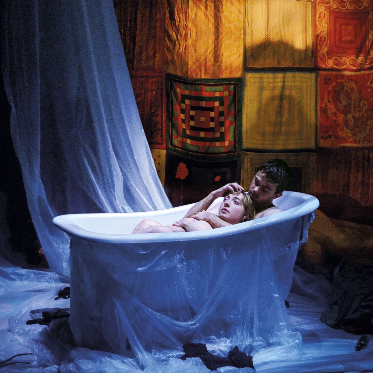 Au départ, tout l’appartement est couvert de toiles en plastique, il attend probablement d’être peint. Une belle baignoire blanche s’impose à l’avant-plan de la scène, elle aussi dissimulée. Une jeune fille monologue, d’un ton vif et nerveux. Progressivement, elle soulève le plastique. On découvre son compagnon, assis dans la baignoire.