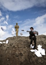 Pendant ce temps, sur la scène, un comédien se produit devant les caméras. Seul au milieu des écrans bleus, il se rêve à Hollywood. Il s’agite sur le plateau, aussi solitaire que son personnage, et utilise son imaginaire pour construire l’histoire en temps réel. Pris dans son récit, il joue devant un public sans jamais s’adresser à lui, et nous l’observons interpréter le film que nous sommes est train de regarder. Comme une sorte de « making-of » visible en réel, comme si les bonus étaient visionnés en même temps que le film original.
