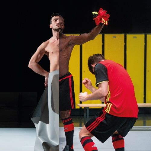 Dans un vestiaire de football, onze hommes débarquent en maillot noir jaune rouge (la création a eu lieu avant la Coupe du monde en Russie). Sculptés comme des Éphèbes, ils blaguent, se congratulent, de manière très virile sur fond de musique électro et dans des lumières stroboscopiques. Des mâles dans toute leur splendeur et toute leur testostérone : on ne voit que les muscles et la sueur.