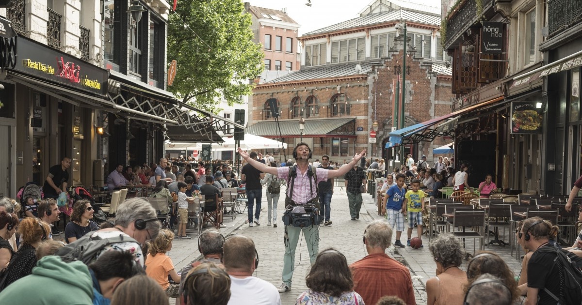 La promenade prend un détour musical dont vous serez les auditeurs privilégiés, et pour laquelle vous serez vivement encouragés à remplir la place des chœurs et à reproduire une chorégraphie. Pas d’inquiétude à avoir sur votre allure que le groupe anonymise. Les passants rencontrés sur votre route vers la sérénité deviennent malgré eux les acteurs de la pièce, grâce aux improvisations en micro caché de l’étonnante paire de guides.