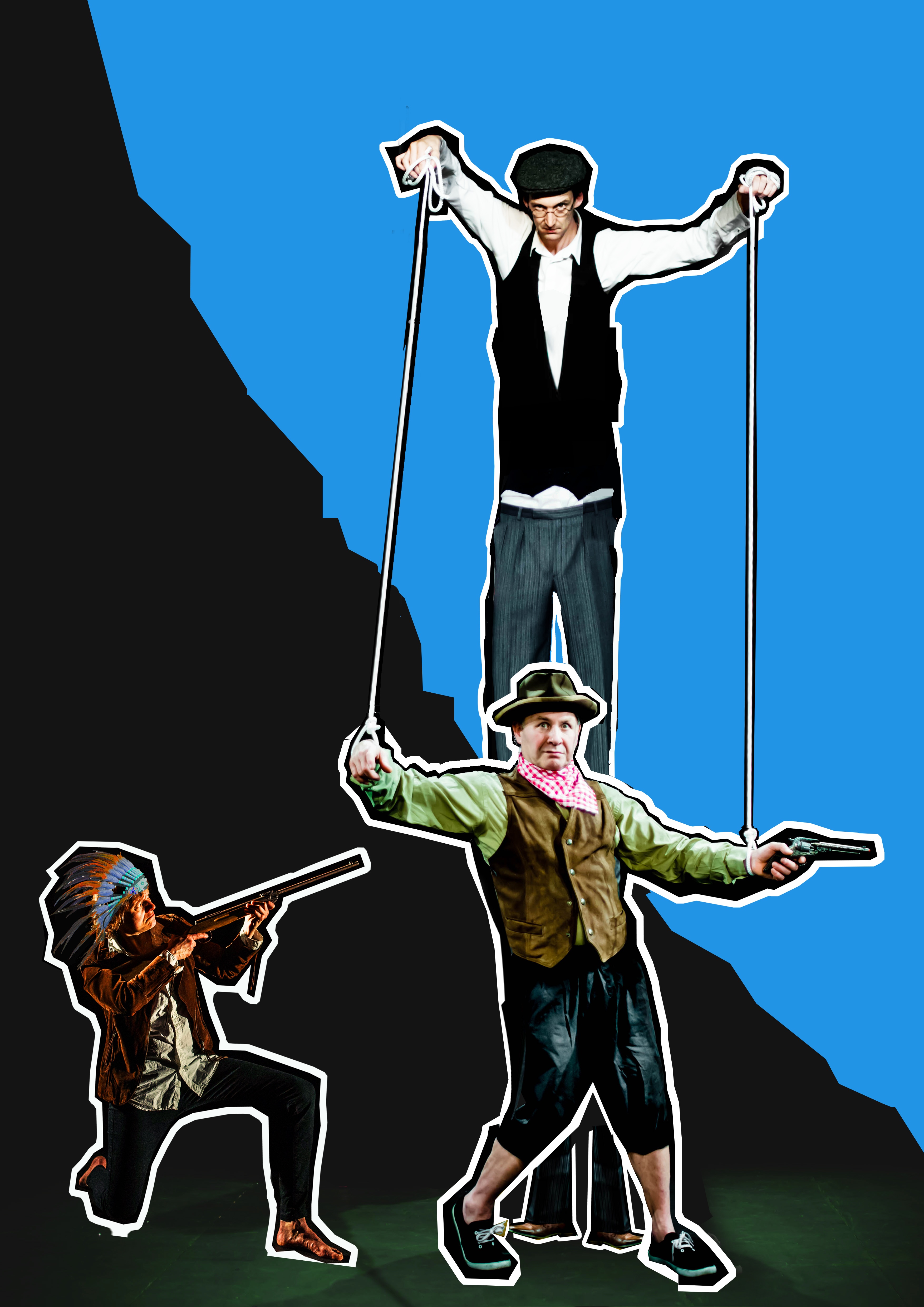 L’univers scénographique joue sur cette double lecture : trois toiles peintes annoncent "C’est un western" avant de révéler en s’écartant "En fait, c’est un théâtre", des rochers deviennent des caisses à outils, des costumes à deux faces permettent de tenir plusieurs rôles, et d’autres passent de la fiction en carton à la réalité du tissu pour souligner la porosité de cette frontière pour la marionnette. Il y a un aspect "théâtre de la débrouille" inventif qui donne un ton léger et bon enfant. La question de la convention réapparaît : derrière des rideaux peints se cache une "loge" où le marionnettiste va se réfugier entre deux moments de scène. Pensée comme un assemblage de flight-case pour évoquer le milieu de la technique de spectacle, ce n’est en réalité qu’une façade en bois peinte, dans laquelle un cadre découpé permet de voir les comédiens qui se trouvent derrière et jouent comme s’ils étaient face à leur miroir.